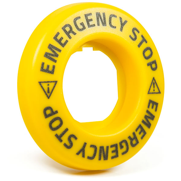 The EMAS BET60LED2 Backlit Legend is a 24V AC/DC constant blinking emergency stop plate with LED. This legend is marked with 'Emergency Stop' and warning hazard symbol.