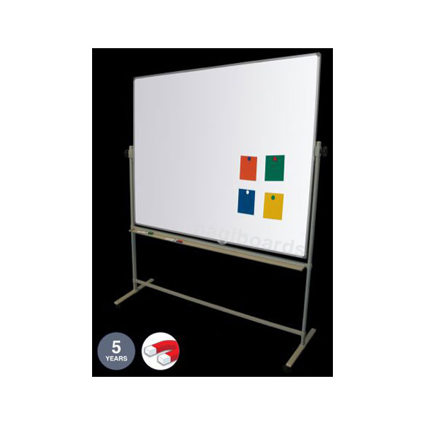 A double sided enamel steel whiteboard on a mobile stand. This board has a special locking handle that allows you to rotate the board through 360 degrees and to lock your board firmly in place at any angle to suit you.