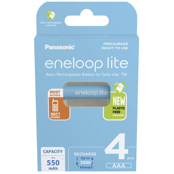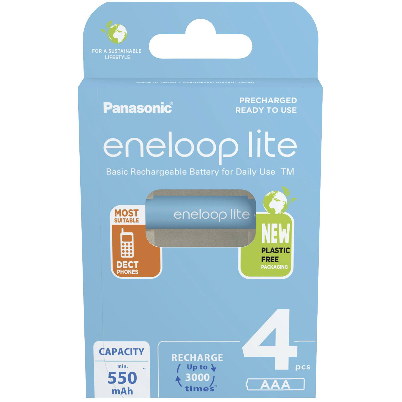 Panasonic's Eneloop lite HR03 AAA batteries are rechargeable NiMH cells with a capacity of 550 mAh and a voltage of 1.2 V. These low self-discharge batteries are perfect for frequent use in everyday devices such as remote controls, clocks, and small electronics. Eneloop's innovative design ensures long-lasting performance and reliability in various low-drain applications.