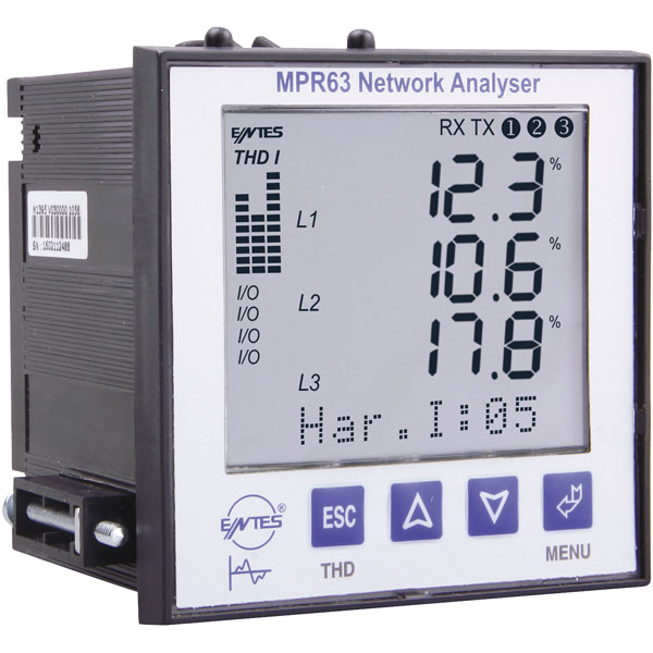 The ENTES MPR-63-42 is a Network Analyser with THD, up to 31th Harmonics measurement, RS-485 (MODBUS), Alarm Contact and 1 Mbyte Memory. It is based on DSP (Digital Signal Processor), and designed for the purpose of measuring all parameters in industry plants. The measured parameters can be displayed on LCD screen which has dimension of 3.6 inches and can be read easily in dark environments by activating the Back-Light function.