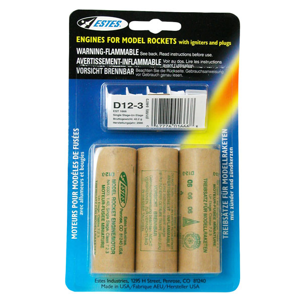 The Estes D12-3 is a single stage engine designed for model rocket flight. This standard engine is designed for flights in rockets weighing less than 14 ounces, including the engine. This pack includes 3 C6-5 engines, 3 igniters and 4 igniter plugs. Offering high quality and proven reliability, Estes engines are considered to set the standard in the model rocket industry.