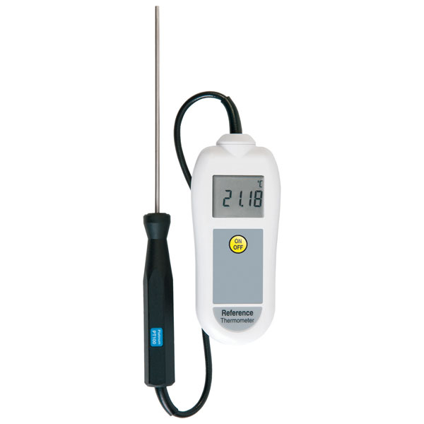 The Reference thermometer is ideal for comparison checking the calibration and accuracy of other thermometers and probes, when used in conjunction with a stable temperature heat or chill source. The instrument measures temperature over the range of -199.99 to +199.99°C with a resolution of 0.01°C. It has a simple on/off push button with open circuit 'Err' and low battery indication.
