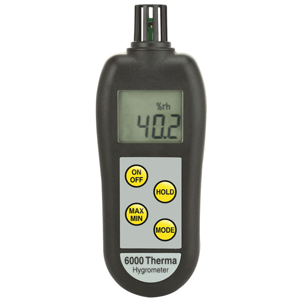 The hygrometer has a host of rich features, including a custom LCD displaying % RH, °C/°F, dew point indication, max/min and hold. There is also an automatic display of both open circuit and low battery, while the temperature and humidity can be displayed at the push of a button separately. It is powered by three AAA batteries (not supplied) with a minimum life expectancy of 10,000 hours. An auto-power off facility turns the therma-hygrometer off automatically after 10 minutes, maximising battery life.