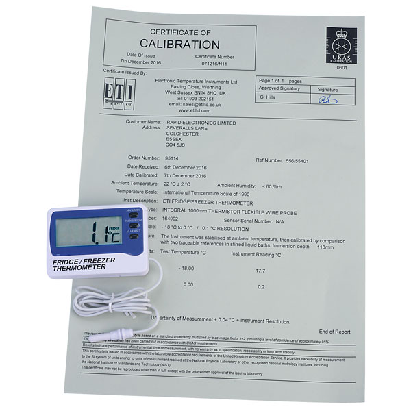The thermometer is supplied with a 2-point UKAS Certificate of Calibration. Each certificate indicates deviations from standards at various check points.