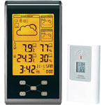 Equipped with a host of other features, including: radio-clock with manual setting option, 12/24 hour display, date, weekday display in 5 languages (GB/FR/DE/ES/IT), °C/°F display, max/min-value memory for temperature, 2 alarms, 5 minutes snooze, backlight (through keystroke), table stand (stand with magnetic mount included) or wall mounting, symbols for weather forecast (calculated over recording of atmospheric pressure), moon phase, current barometric pressure, trend indicators for indoor/outdoor temperature, indoor/outdoor humidity and air pressure, outdoor sensor with display.