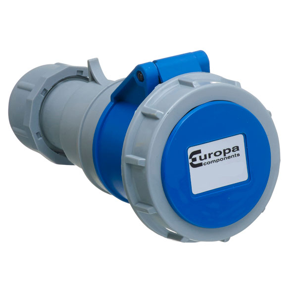 This 230V industrial mains in-line socket from Europa Components is IP67 rated and has a 6 to 16mm cable cross-section capacity, giving it a current rating of 63A.