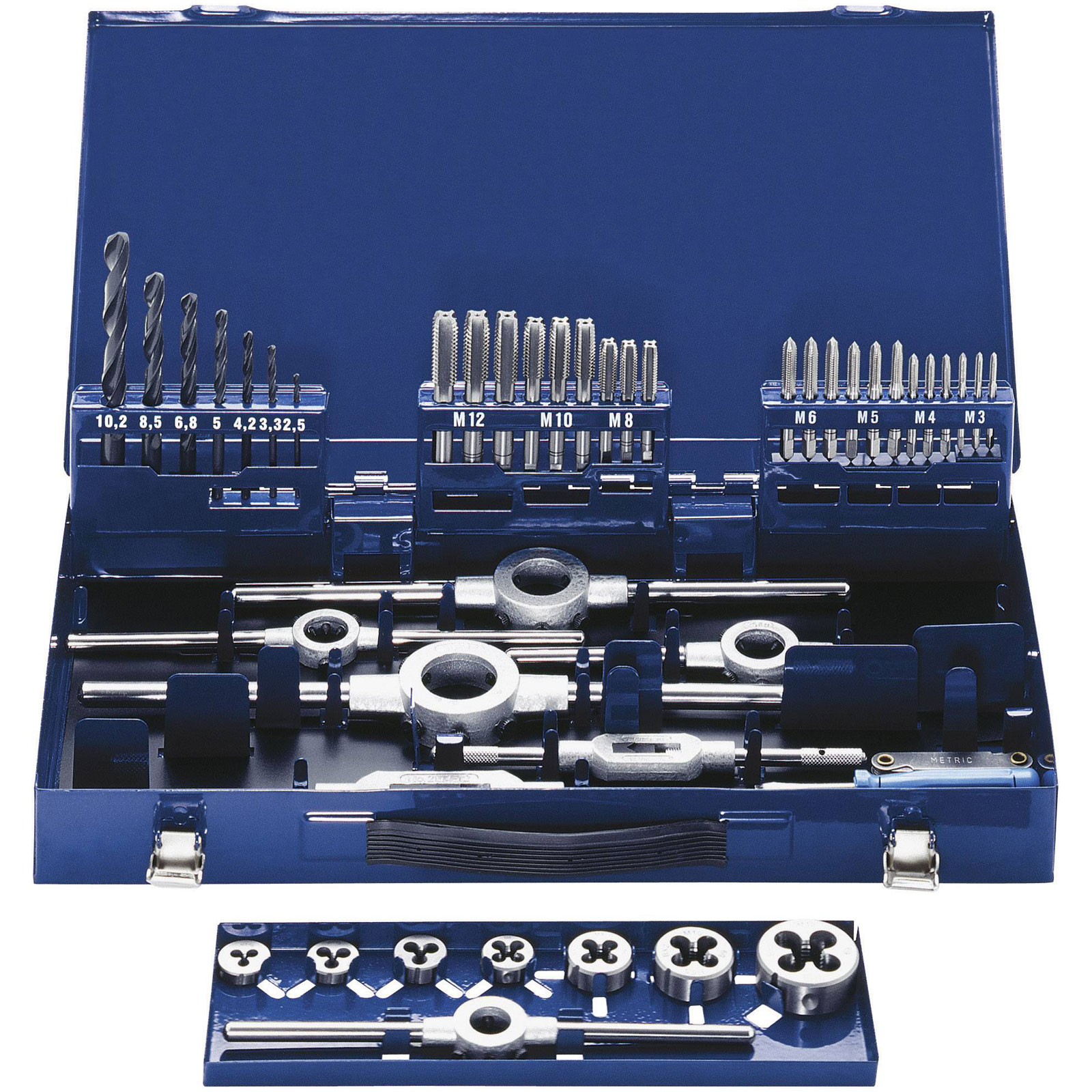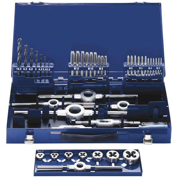 The Eventus by Exact 10721 tap tool kit is a 49-piece set featuring high-speed steel metric taps and dies, ranging from M3 to M12. This assorted tap and die set is ideal for cutting and repairing threads in metalworking and mechanical applications. It provides precision and durability for professional and DIY users.