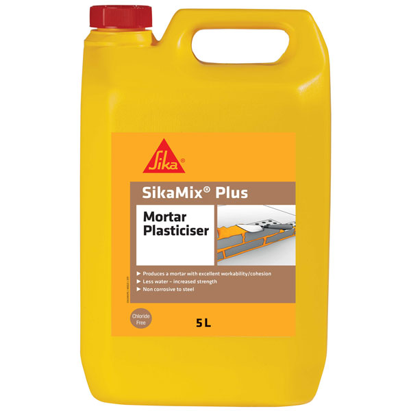 Everbuild Sikamix Plus is a general purpose, economic liquid plasticiser and improver for brick and blockwork mortars. It reduces water demand and increases strength. It also improves the frost resistance of hardened mortar while also reducing efflorescence.