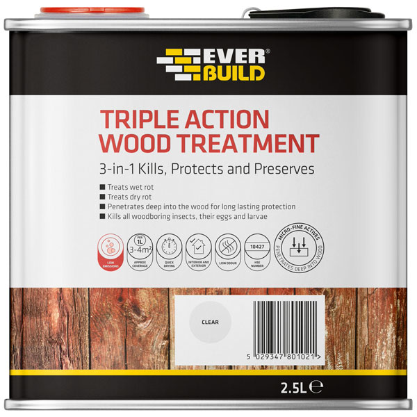 Everbuild Triple Action Wood Treatment takes care of remedial wood treatment and preservation in one can. It is specially designed to deeply penetrate all wood and joinery to give lasting protection from damage caused by wet rot, dry rot, fungi and wood boring insects/larvae. Fast drying.