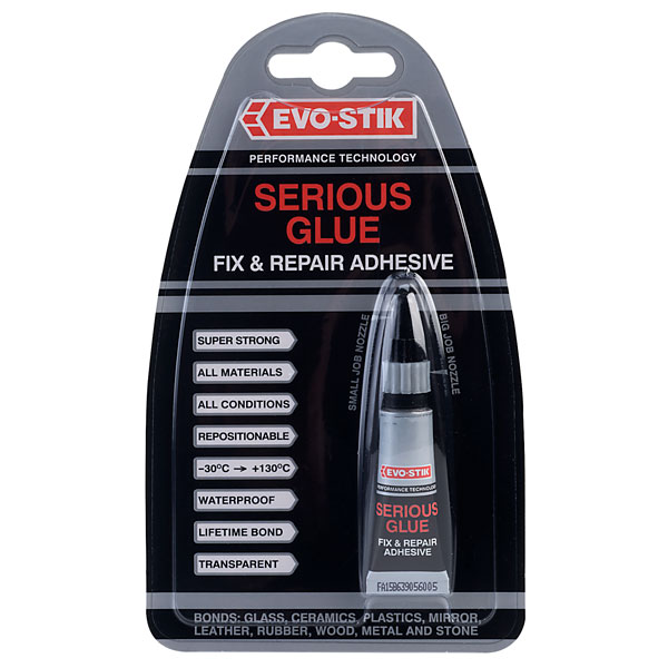 This extremely strong Serious Glue from Evo-Stik sticks everything to almost anything and is ideal for all fixing and repair jobs inside and outside the home.