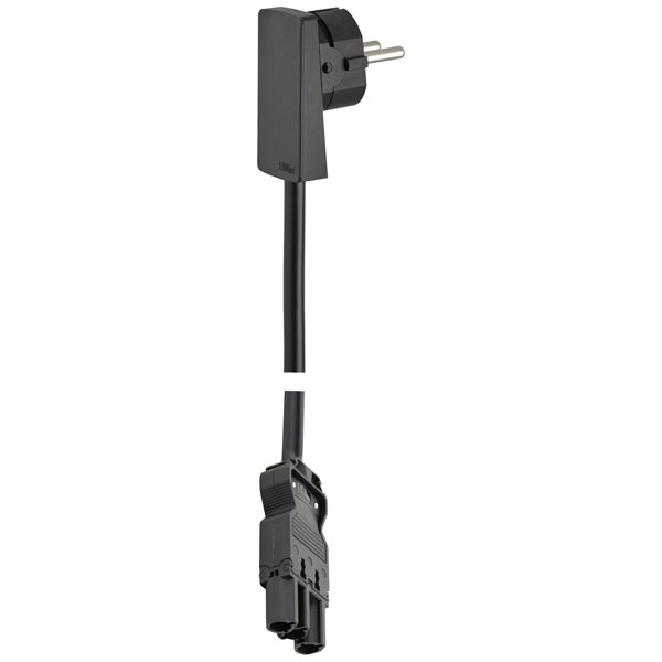The EVOline 1512 0015 2100 Current Cable by EVOline is a 1.5-metre long, black mains cable designed for efficient power distribution. It features the Plug Mini Fix connector and is ideal as a feeder cable in various electrical installations. This robust power cable is commonly used in office or home setups to connect electrical devices to the main power supply.