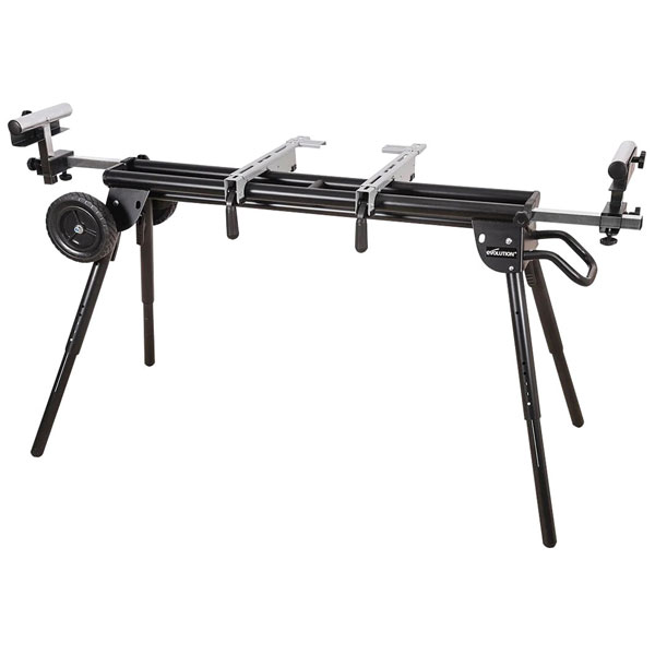 The Evolution XL Rolling Mitre Saw Stand made with universal fittings and 5-position height adjustment. It can support work pieces up to 4m in length and up to 300kg in weight. Perfect for handling full length ceiling beams and floor joists.