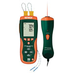 The Extech HD200 is a differential thermometer with innovative technology. It can detect the temperature differences with the contact thermo element measurement sensors. With the IR thermometer sensor you can conduct contactless measurements of surface temperatures. It possesses a wide three line LCD display, in which the IR-measurement (T1, T2 and T3) or the temperature difference measurement (T1-T2, T1-T3 or T2-T3) are shown. The temperature difference in case of T1-T2 is used for high-temperature measurements in heating and air-conditioning systems.