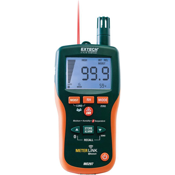 The Extech MO297 with MeterLink bluetooth capabilities is for use with Flir infrared cameras. This pinless moisture meter incorporates a patented Built in IR thermometer and 20 point memory.