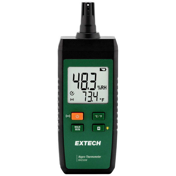 Extech's RH250W Hygrometer is a reliable indoor relative humidity meter designed for monitoring air quality. It features a mould detector, making it ideal for building moisture and mould alert applications. This hygrometer is an essential tool for maintaining healthy indoor environments in homes or offices.