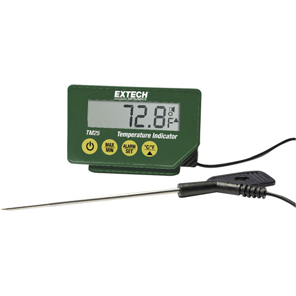 The Extech Instruments TM25 is a Waterproof, Portable, Wall Mountable Temperature Indicator. This indicator has been designed and manufactured for measuring the temperature of air, liquid, paste, or semi-solid materials. The TM25 is equipped with a penetration probe for insertion into materials under test.
