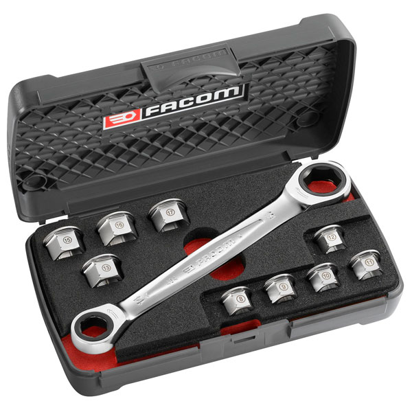 This 11-in-1 ratchet wrench set from Facom provides a lightweight alternative to carrying around a full set of ring spanners. The high-quality wrench is 3 times slimmer than traditional tools so is ideal for use in spaces where access is difficult. The set includes a wrench with a 14mm head at one end an a 19mm head at the other, plus 9 reducer bushes.