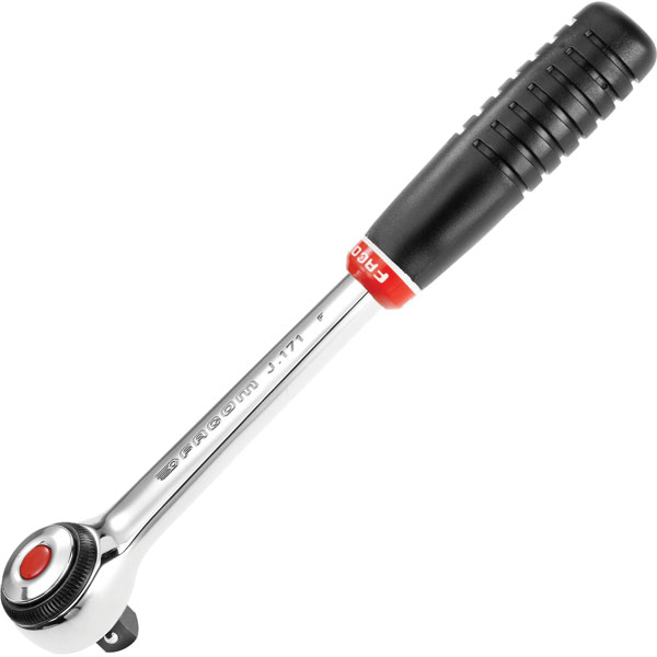 This ⅜in ratchet from Facom has a safety locking mechanism which ensures that sockets remain in place where required and do not fall into inaccessible places or get lost in machinery.