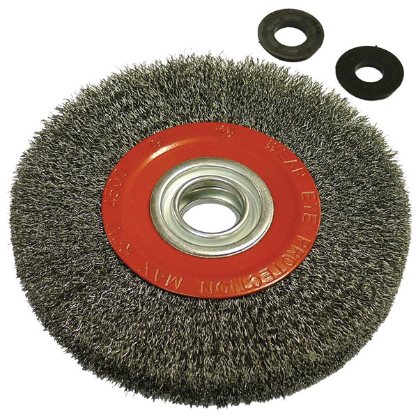 A crimped steel circular wire brush designed to be mounted on a bench grinder. The wire wheels are ideal for the removal of rust, corrosion, paint, weld spatter and general surface deburring. It is supplied complete with plastic inserts (bushes) to enable the wheel to be mounted on grinders with smaller drive spindles.