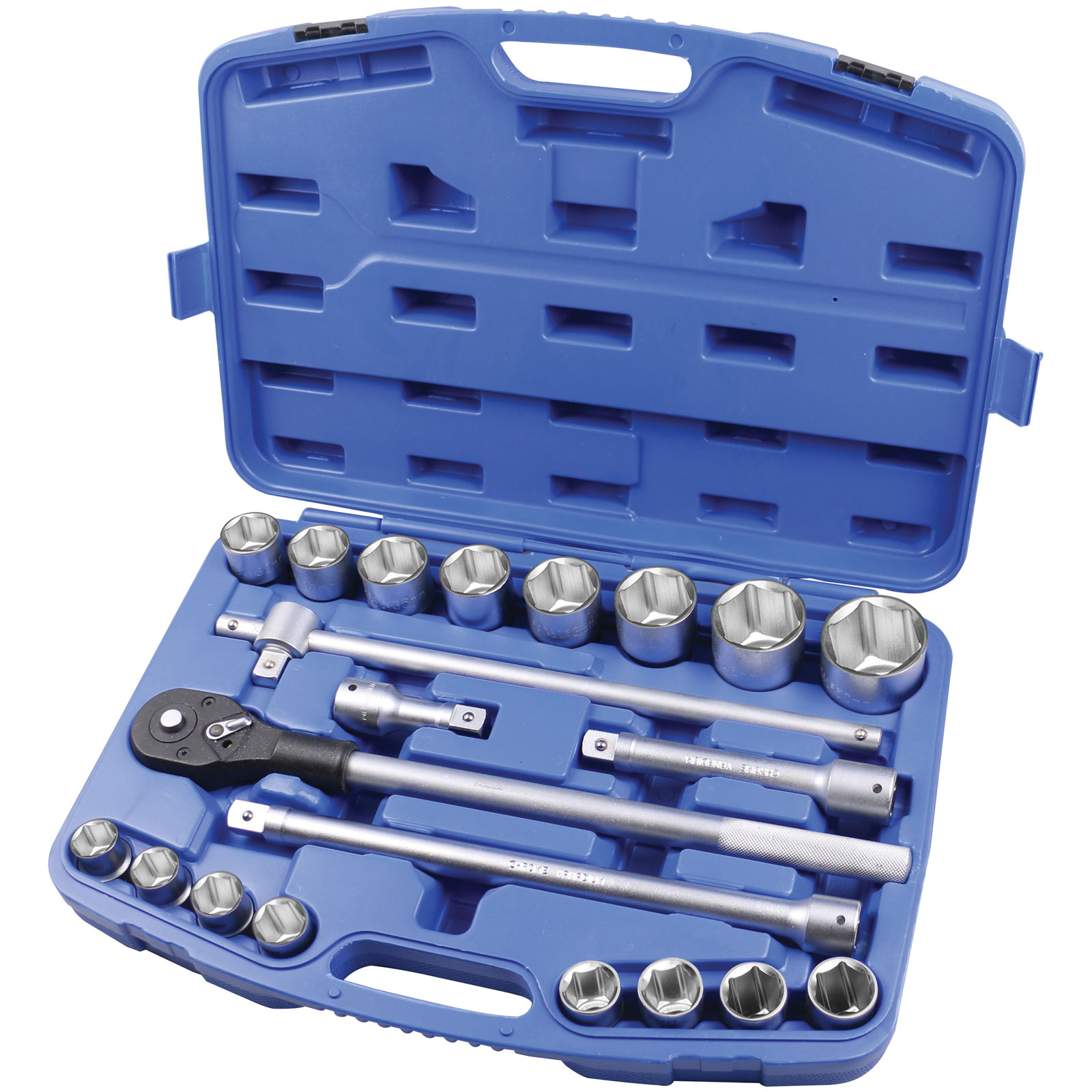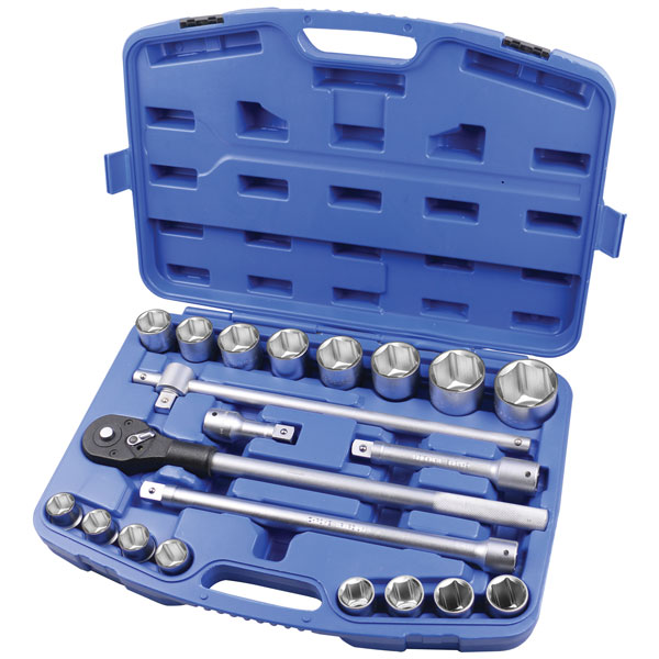 The Faithfull 21 Piece 3/4in Square Drive Socket Set includes a selection of chrome vanadium hexagonal sockets and popular accessories, and features a 72 tooth, smooth action, soft grip ratchet handle with a quick-release mechanism.