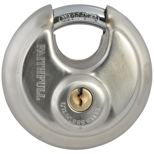 This Faithfull Discus Padlock has a waterproof, anti-corrosion stainless body and a hardened steel shackle. It has a 5 pin brass tumbler lock mechanism giving 1,875 key differs and is supplied complete with 3 keys.