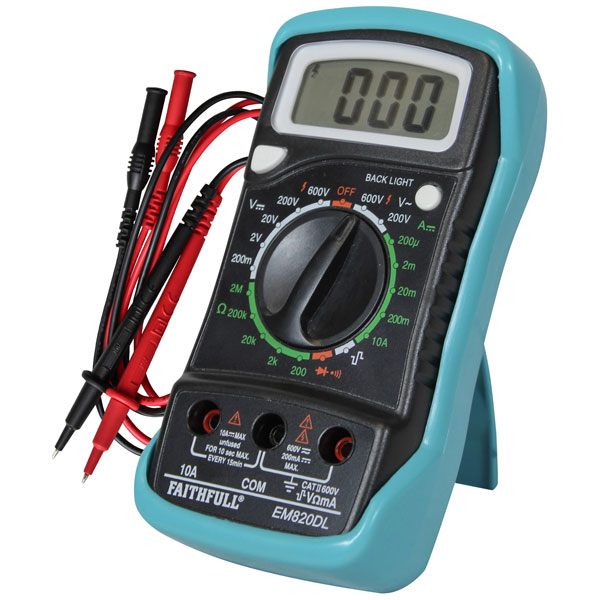 This handy Faithfull Multimeter can be used for the measurement of DC / AC voltage, DC current and Resistance and for Diode and Transistor testing and Audible Continuity testing. This meter is ideal for performing many checks used in radio and electronic testing, car electrics, household appliances, portable tools and similar equipment. All test functions are easily accessible by rotating the 20-position range selector switch to the required function. The multimeter has many features to facilitate safe use including overload protection, recessed input terminals, automatic negative polarity and over-range indication. Additional features include a rubber protective housing with integral stand for easy visibility, a large 3½ digit LCD backlit display with auto power off and low battery warning.