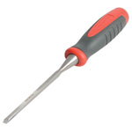 The bevelled edge blade design makes the chisel ideal for both fine work and for cutting into tight corners. The red polypropylene handle has an anti-slip, soft-grip coating for user comfort and the steel striking cap provides added protection for when used with a mallet, or an occasional hammer blow.