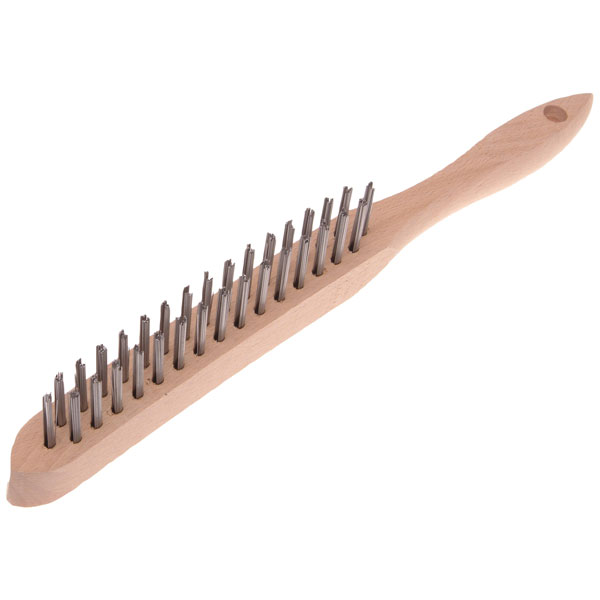 Faithfull quality scratch brush with bristles made from hardened and tempered steel. For use in preparatory work, when removing rust, scale, old paintwork and grouting. The handles are drilled for hanging.