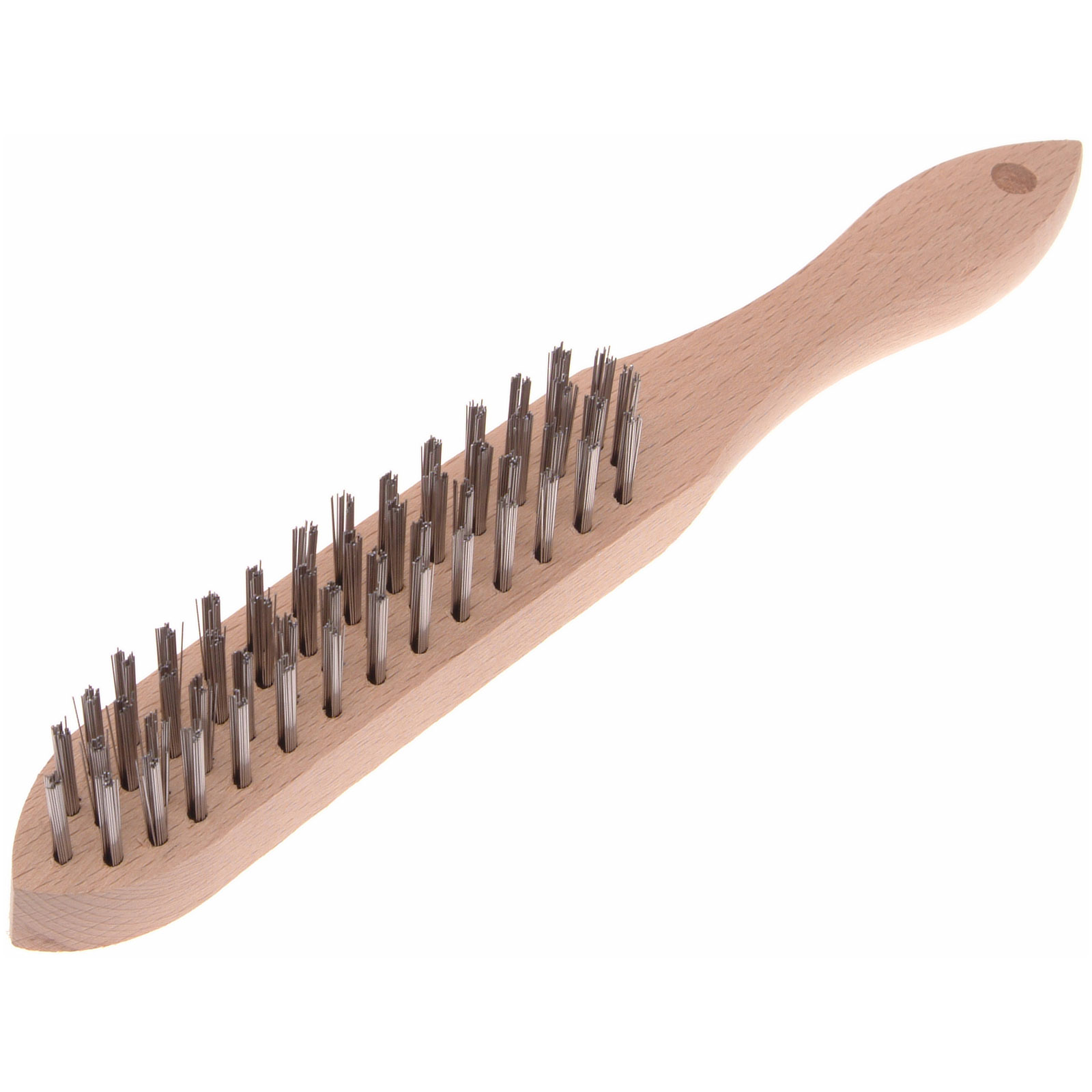 Faithfull quality scratch brush with bristles made from hardened and tempered steel. For use in preparatory work, when removing rust, scale, old paintwork and grouting. The handles are drilled for hanging.
