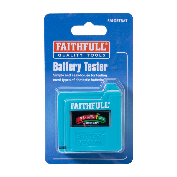 This Faithfull Battery Tester is simple and easy-to-use on most types of standard domestic and rechargeable batteries. It helps to ensure the batteries are fully charged and ready for use. A simple analogue needle display indicates the power level of the batteries (good, low or replacement required). An adjustable arm allows the tester to accommodate the testing of D, C, AA, AAA, 9V 6F22 and 1.5V button cell batteries, and folds down for easy storage.