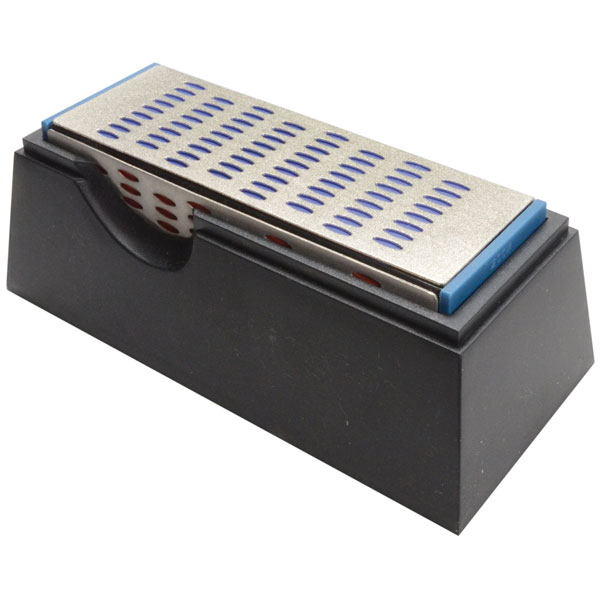 A 4-sided diamond sharpening stone supplied with a worksafe surface gripping base for quick, easy and effortless sharpening of any blade.