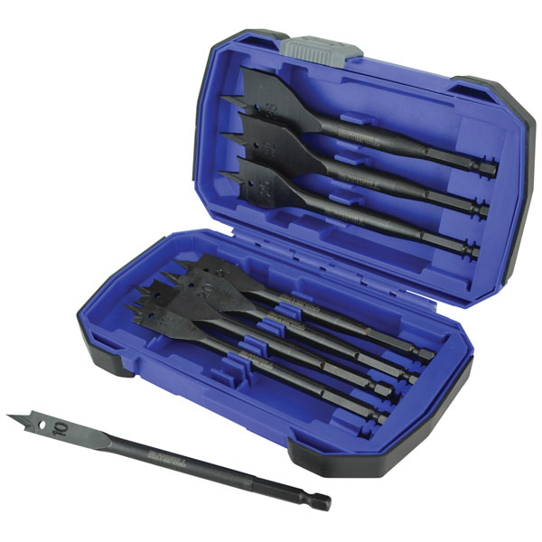 The Faithfull 8 Piece Flat Bit Set will bore all types of timber, across or with the grain easily and cleanly. Each bit has precision ground points and cutting edges with extended spurs for faster cutting. The ¼” hex shank can be used with quick-release systems and may be used with both mains and cordless drills. Supplied in a sturdy case.