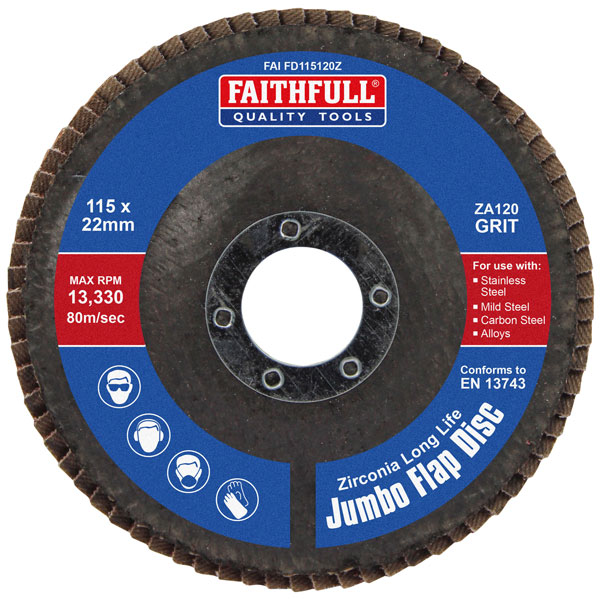 1 x Faithfull Zirconia Abrasive Jumbo Flap Disc ZA120 115mm. 120 grit is suitable for smooth grinding. The slightly conical shape is ideal for grinding at 15–25-degree angles on contoured surfaces.