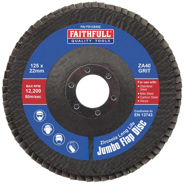 1 x Faithfull Zirconia Abrasive Jumbo Flap Disc ZA40 125mm. 40 grit is suitable for rough grinding. The slightly conical shape is ideal for grinding at 15–25-degree angles on contoured surfaces.