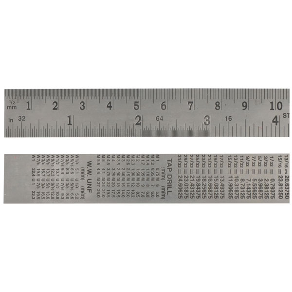 These Faithfull flexible stainless steel rule with permanently etched metric and inch readings. The rule is graduated in 16ths, 32nds and 64ths of an inch on one side and 0.5 and 1mm on the other. With handy conversion tables etched on the reverse and hanging holes for easy storage.