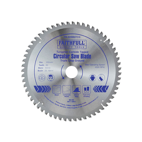 Faithfull Professional Triple Chip Ground TCT Circular Saw Blade with 7mm Tungsten Carbide Tipped teeth to ensure a long working life and accuracy of cut. Each blade has laser cut expansion slots to improve their performance by reducing heat build up.