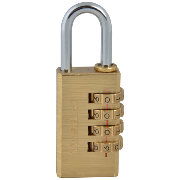 The Faithfull Combination Padlock has a solid brass body with a 4-pin brass tumbler mechanism. It has a hardened and plated steel shackle encompassing a self locking action.