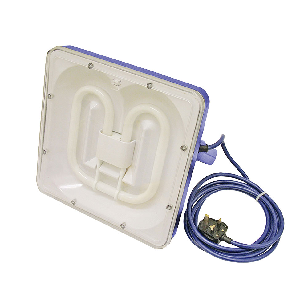 They are popular with a large number of tradesmen, especially plasterers as they emit very little heat. It also has two built-in power outlets for in-series linking. The lamp can be used free standing, hung or fixed to a surface using the holes provided in the fold out handle.