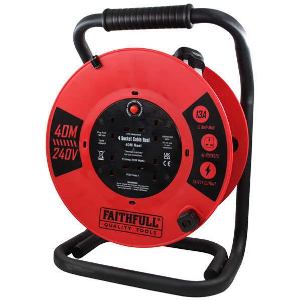 This Faithfull Open Cable Reel has a sturdy steel frame construction. The four outlet sockets allow you to run one or more power tools etc. A winding knob for easy and tangle free reel-in. Fitted with a carry handle for easy movement around the worksite or home.