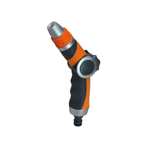 Features a zinc alloy body with an easy grip soft coating. The head also has an integral stand to allow the nozzle to sit on the ground for use as a sprinkler.