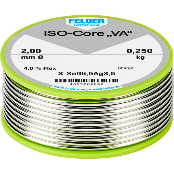 Felder produces the ISO-Core "VA" solder reel, which is a 0.250 kg spool of soldering wire with a 2 mm diameter. This high-quality solder is composed primarily of Sn96.5 and Ag3.5, ideal for precise and reliable soldering tasks. It's commonly used in electronics and electrical applications for creating strong, conductive connections.