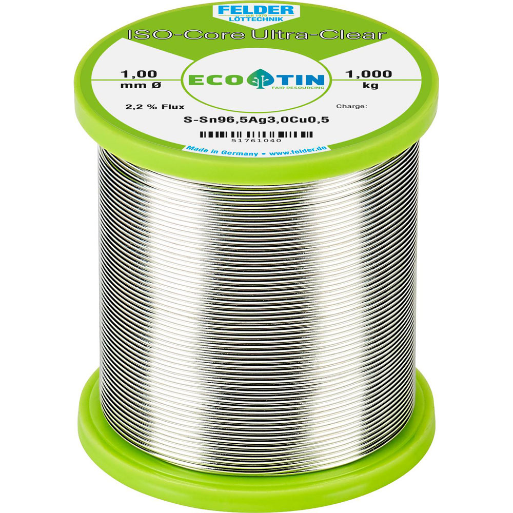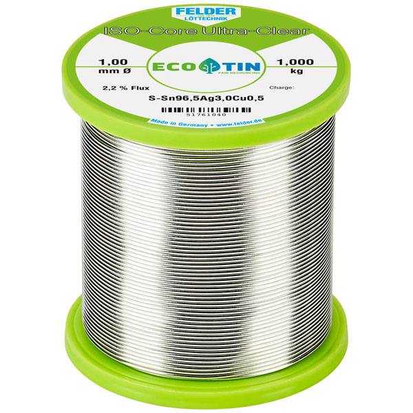 Felder ISO-Core "Ultra Clear" SAC305 soldering wire, which is composed of 96.5% tin, 3% silver, and 0.5% copper. This solder reel, with a 1 mm diameter and weighing 1 kg, is ideal for high reliability soldering applications. It is particularly suited for electronic assembly and repair tasks.