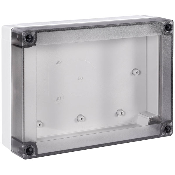 The Fibox PC 150/50 LT universal enclosure is a durable polycarbonate case in a grey-white RAL 7035 colour, measuring 180x130x50mm with a clear cover. It is ideal for protecting electrical components, and its robust design makes it suitable for challenging environments. Typical applications include housing delicate electronics or components in industrial or outdoor settings.