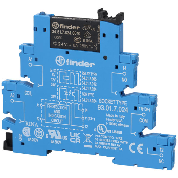 The Finder 24V Relay 6A Interface Module 38.51 is a high quality 35mm DIN rail mounting relay interface module from Finder.