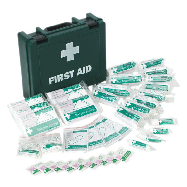 First aid kit in a durable composite case with hinged lid, folding handle and wall fixing bracket. Suitable for a medium risk environment with up to twenty people.