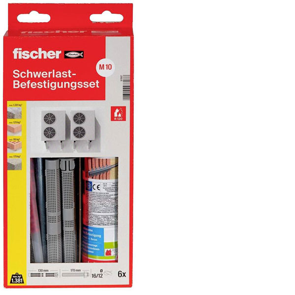 The Fischer 300 T SBS Set M 10 heavy duty fastener set is designed for robust and secure fastening applications. This set features high-quality materials suitable for industrial or construction use where heavy loads are expected. Ideal for use in concrete or solid substrate mounting scenarios.
