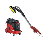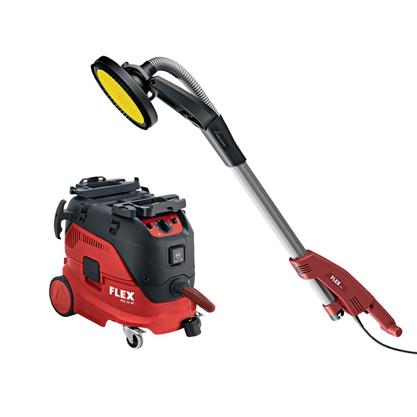 The FLEX Power Tools GE 5 R + TB-L Giraffe® Sander is fitted with a revolving edge segment that enables the processing of wall/wall and wall/ceiling surfaces. The edge segment rotates with the movement of the machine, so it doesn't interrupt work flow. The Giraffe® Sander uses electronic controls: controlled constant speed, soft start, overload protection and speed selection with an adjuster wheel. The gimbal-mounted sanding head provides high flexibility and optimum adjustment.