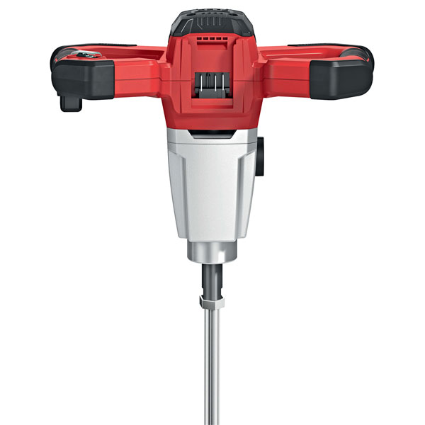 Fitted with a 3-level (cleaning, stirring up and mixing) switch that can be reached from the grip position without interrupting work. There is also a rotary switch to set the optimum mixing speed: speed 1 for highly viscous materials, speed 2 for medium and low viscosity materials, and an accelerator switch for a slow and gentle start. The flexible rubber sleeve over the on/off switch prevents the ingress of dirt. No malfunctions caused by jammed switches.