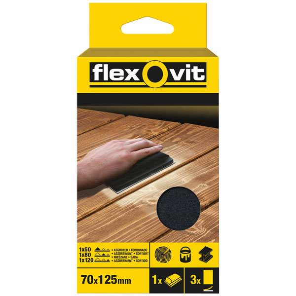This sanding block kit from Flexovit contains an assortment of aluminium oxide abrasive sheets and a sanding block. This block is very comfortable to use and has a hook and loop backing system to allow for quick and easy sheet changing.