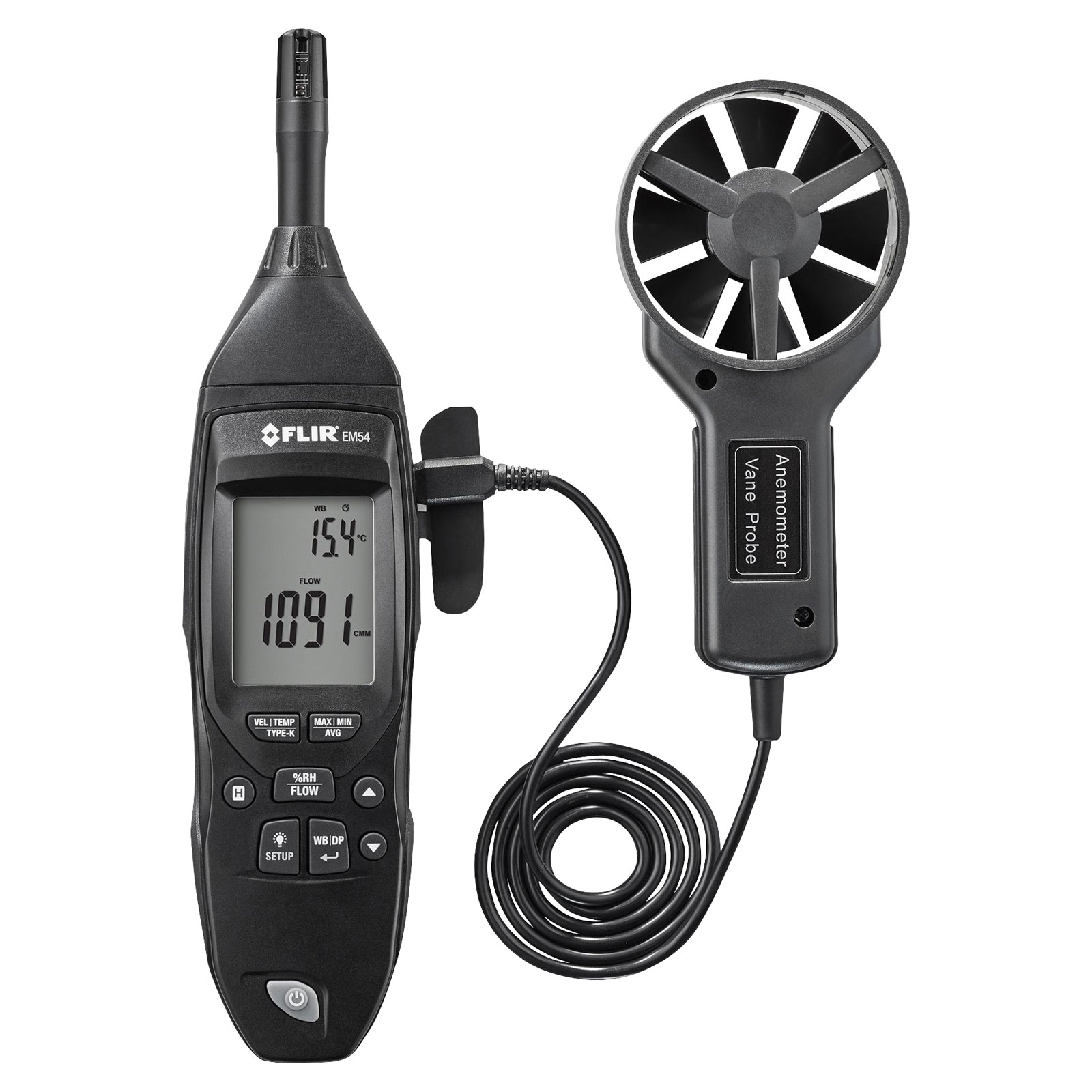 The meter can help you verify that duct inlets and outlets have the specified volumetric flow - a prerequisite to an efficient functional system. Featuring humidity, wet bulb, and dew point functions, the EM54 can measure deviations from proper relative humidity levels. Plus, the included Type-K contact temperature probe is useful to check electric motors and thermal equipment components for proper operating temperatures.